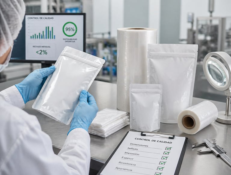 Cada empaque pasa por controles estrictos de producción. Meta de menos del 2% de rechazo mensual y disponibilidad operativa superior al 95%.